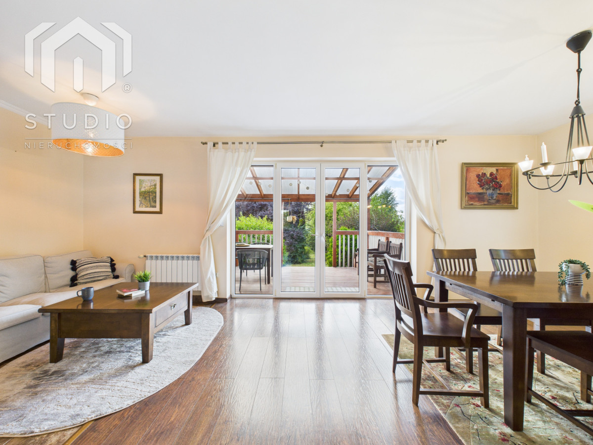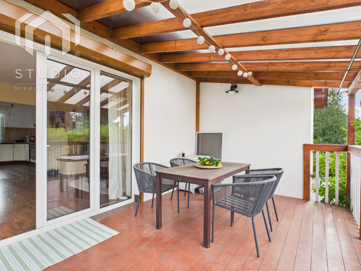 Z salonu wychodzi się na zadaszony, drewniany taras - idealny na poranną kawę czy wieczorne rozmowy przy śpiewie ptaków.