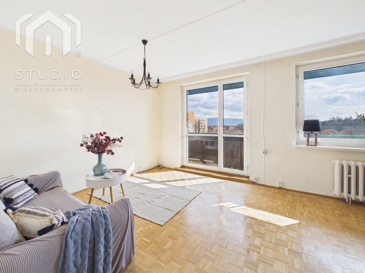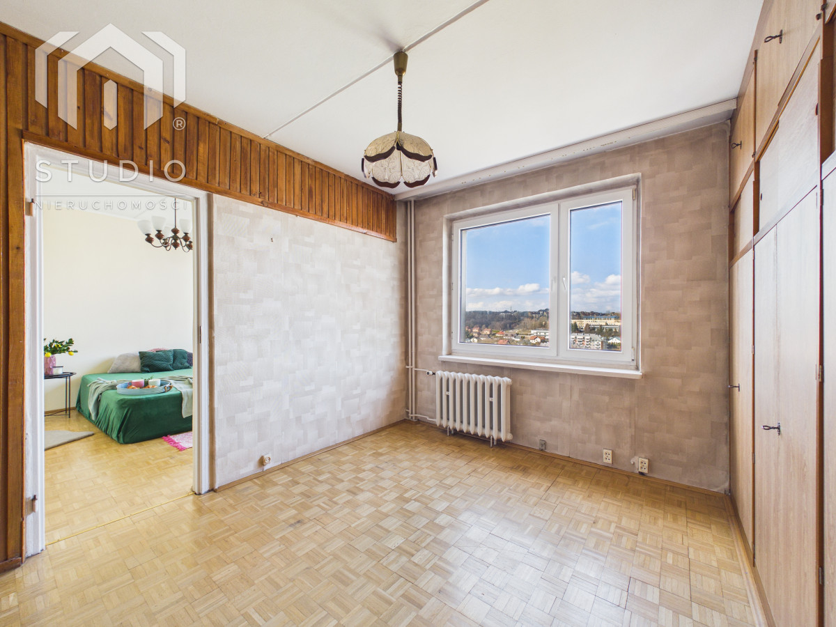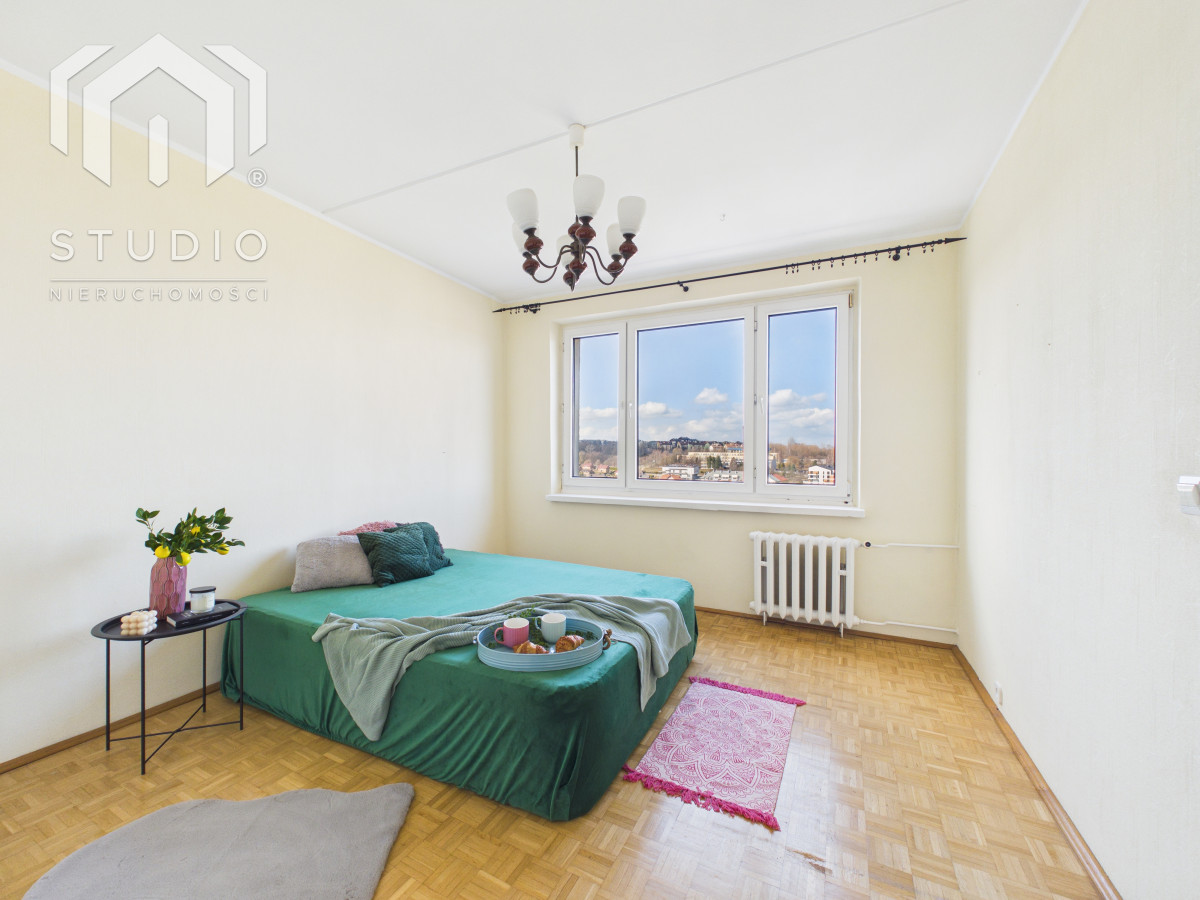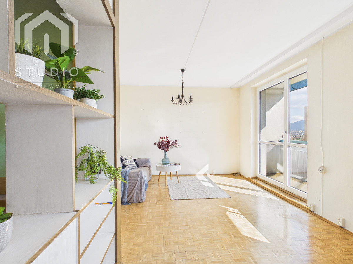 Lokal o powierzchni ok. 69 m² położony jest na siódmym piętrze 10-piętrowego budynku z windą. Mieszkanie wymaga remontu lub odświeżenia, co daje nowemu właścicielowi możliwość aranżacji wnętrza według własnych potrzeb. Okna PCV z ekspozycją północ-południe zapewniają bardzo dobre doświetlenie - mieszkanie jest jasne i słoneczne przez cały dzień. Z dużego balkonu rozpościera się piękny, panoramiczny widok na miasto oraz pasmo gór, który zachwyca o każdej porze dnia